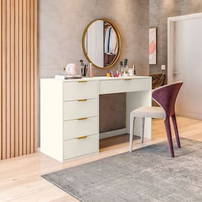 A Penteadeira Vita une praticidade e estilo em um design moderno e sofisticado. Composta por 5 gavetas espaçosas, sendo 4 laterais organizadas em formato de gaveteiro e 1 gaveta central maior sob o tampo, que oferece amplo espaço para armazenar maquiagens, acessórios e objetos pessoais com praticidade, pois conta com um porta-objetos interno, ideal para manter tudo em ordem e sempre à mão.