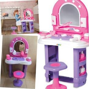 Isso mesmo, com espelho, banquinho e diversos acessórios para brincar com a turma. Além do espelho que é retrátil (3 posições), a penteadeira vem com porta jóias, mini porta retrato e frascos de perfume para que a produção seja completa.