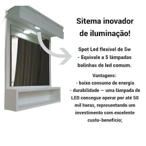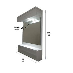 Penteadeira camarim suspensa de parede jade foi desenvolvida com materiais de alta qualidade, inclui espelho reforçado, spot led equivalente a 5 lâmpadas de led normal que irá ajudar no seu dia a dia na hora de fazer a sua makeO produto é entregue montado, só instalarMaterial: 100% mdfCor: branca Espelho incluso.Led inclusoFiação inclusaO produto segue com as furações, parafusos e manual para instalação.Possui spot led de 5w equivale a 5 lampadas de led comum do estilo bolinha .O spot led também é conhecido como lâmpada croica, são equipados com chip de alta qualidade garantindo uma iluminação segura, econômica e excelente para suas makesMaterial: 100% mdfCor: branca Medidas: Espelho: 45 x 40 cm Medidas do espelho podem variar em cm'sMoldura: Largura 52 cm Altura 67,5 cmPrateleira de cima: Profundidade : 15 cm Largura: 52 cmPrateleiras de baixo: Profundidade: 10 cmLargura: 52 cmEspaço entre as prateleiras de baixo: 10 cm Fio com interruptor: 1,20 cm Marca: Marcenaria Sales & Alves