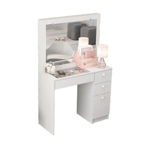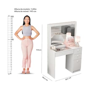 CARACTERÍSTICAS - Revestimento em impressão ultravioleta (UV) - Produzido em MDP - O tampo suporta até 10 kg. - Gavetas que suportam até 5 kg cada. - Gavetas com corrediça metálica - Penteadeira com 1 espelho incluso - Gaveta central com divisória