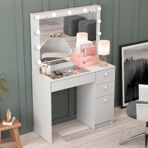 CARACTERÍSTICAS - Revestimento em impressão ultravioleta (UV) - Produzido em MDP - O tampo suporta até 10 kg. - Gavetas que suportam até 5 kg cada. - Gavetas com corrediça metálica - Penteadeira com 1 espelho incluso - Gaveta central com divisória - 1 Kit Luz Incluso - Peso: 35,67 kg - Altura: 143 cm - Largura: 90,5 cm - Profundidade: 39,20 cm
