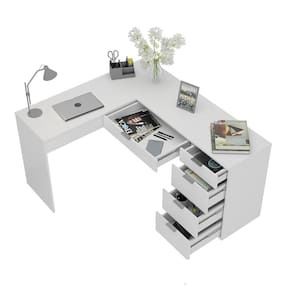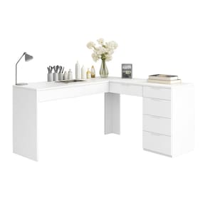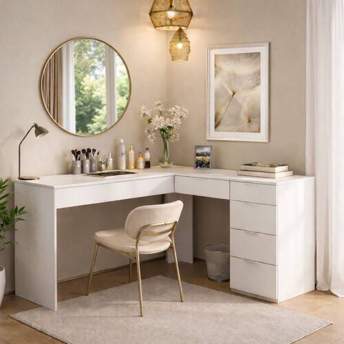 A Penteadeira em L Elegance 5 Gavetas Branca sem Espelho é a escolha perfeita para quem busca organização, funcionalidade e elegância no quarto ou no home office. Seu design moderno em formato de canto otimiza o espaço do ambiente, criando um cantinho prático e sofisticado para cuidados pessoais, maquiagem ou até mesmo para estudos e trabalho.