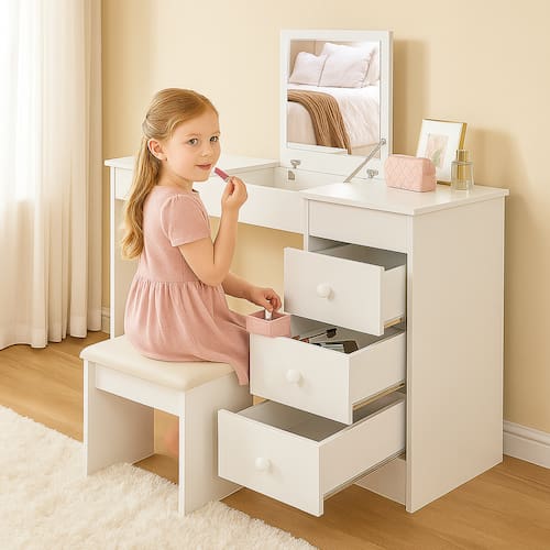 - Design 2 em 1: Funciona como penteadeira e escrivaninha, perfeita para quartos e ambientes compactos.