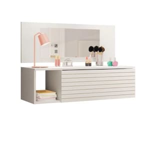 Penteadeira Joy, estrutura em MDP/MDF bio-sustentável de 15 mm, pintura com acabamento UV na cor Branco (Brilho). Composto por 01 gaveta com corrediças telescópicas garantindo um fechamento suave, a gaveta possui ainda uma colméia organizadora, ideal deixar seus itens de forma super organizada, 01 nicho decorativo, acompanha um espelho que será fixado na altura desejada durante a montagem. Este móvel chegará em sua casa separado em 01 volume. Dimensões Altura 60 cm Largura 90 cm Profundidade 33,5 cm Sistema de Montagem Parafusos. Recomendação de Limpeza Limpar com pano seco para retirar o pó. Não aplicar produtos abrasivos. Produtos de Enfeites Não Inclusos.