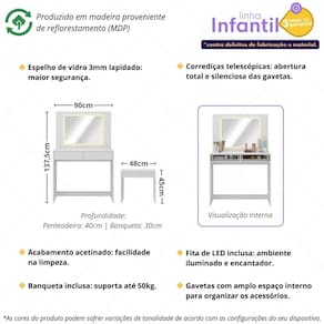 Diferenciais: - Espelho de vidro 3mm lapidado: evita bordas cortantes e oferece segurança para toda a família. - Fita de LED inclusa: iluminação que deixa o cantinho mais especial e encantador. - Banqueta inclusa: confortável e resistente, suporta até 50kg. - 2 gavetas funcionais: com corrediças telescópicas (abertura total e silenciosa), suportam até 3kg cada. - Tampo resistente: suporta até 8kg para decoração e objetos úteis. - Durável e sustentável: produzida em MDP 15mm de reflorestamento, com acabamento acetinado (cerca de 20% de brilho) de fácil limpeza.