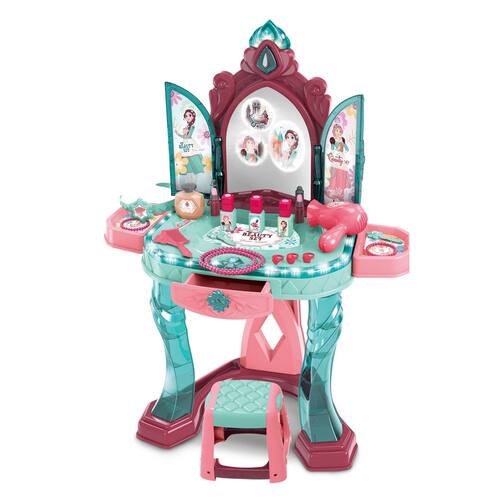 Este conjunto de beleza combina luz e som para uma experiência mágica: ao acenar com a mão na frente da luz, a apenas 5 cm de distância, as portas se abrem e uma linda princesa aparece no espelho, transformando o ritual de se arrumar em uma aventura cheia de fantasia.