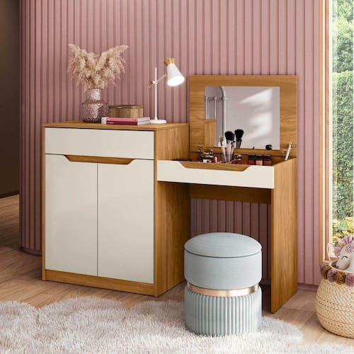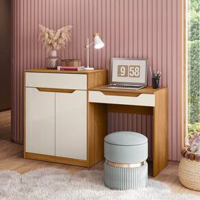 A Penteadeira Escrivaninha Bambolê é um móvel versátil, que proporciona ao seu usuário a melhor organização do ambiente e pode facilitar a sua rotina. Ao abrir o seu tampo basculante com pistão a gás, divisórias internas e espelho, ele se torna uma linda penteadeira, enquanto fechado uma excelente escrivaninha, possui ainda um armário lateral com gaveta e prateleira, e o melhor de tudo é adequado a ergonomia. Acabamento da Porta: Pintura UV Acabamento da Prateleira: Pintura UV Acompanha Banqueta: Não Altura do Espelho: 36 Ambiente Principal: Quarto Infantil Complexidade da Montagem: Alta: deve ser montado por um montador especializado Cor: Carvalho Grife/Off White Cor do Produto: Carvalho Grife/Off White Cor Interna: Carvalho Grife Escala de Brilho: Semi-Brilho Escala de Brilho da Porta: Semi-Brilho Escala de Brilho da Prateleira: Fosco Espessura do Espelho: 3 Formato do Espelho: Retangular Itens Inclusos: 1 Penteadeira, Kit Ferragens e Manual de Montagem Largura do Espelho: 45 Linha ou Coleção: Albatroz Manual de Especificação Técnica: https://cdn2.madeiramadeira.com.br/atributo/albatroz-moveis/1556634-esquema-181-penteadeira-escrivaninha-bambolE.pdf Manual de Montagem e Instalação: https://cdn2.madeiramadeira.com.br/atributo/albatroz-moveis/1556847-esquema-181-penteadeira-escrivaninha-bambolE.pdf Material da Porta: MDP Material da Prateleira: MDP Material dos Pés: MDP Material Principal: MDP Necessita Montagem: Sim Origem do Produto: Nacional Peso: 41.6 Peso Máximo por Prateleira: 5 Possui iluminação: Não Possui Moldura: Não Possui Pés: Rodapé Possui Porta Objetos: Sim Possui Portas: 02 Possui Prateleiras: 01 Possui Rodízio: Não Possui Vidro: Não Quantidade de Espelho: 01 Recomendações de Uso, Manutenção e Limpeza: Limpar com flanela ou pano macio seco, não utilizar produtos abrasivos, desengordurantes, álcool ou solvente. Não expor o produto diretamente á luz solar e á umidade. Sapatas Niveladoras: Não Sistema de Montagem: Parafusos, cavilhas e minifix Suporta Até (kg): 33 Tampo Basculante: Sim Tipo de Dobradiça/Corrediça da Porta: Metálica Tipo de Fixação do Espelho: Parafusos Tipo de Porta: Bater Tipo de Puxador da Porta: Embutido Ean: 7909903441497