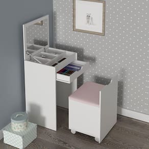 Penteadeira compacta elegante cabe em qualquer mínimo espaço em casa. Possui puff baú encaixado à sua estrutura, uma gaveta e uma tampa com abertura em 90° com espelho colado ao fundo possibilitando extrema facilidade e organização na hora de se embelezar. É de grande utilidade para armazenagem de produtos de como: maquiagens, perfumes, cremes, pincéis de maquiagem, esmalte, sombra, blush, batom, rímel, joia, brinco, anel, base e demais produtos femininos, pois possui espaço interno com divisórias organizadoras em madeira. Com essa penteadeira você irá para guardar todos seus itens de beleza aliado a muito aproveitamento de espaço. Acabamento da Gaveta: Pintura UV Acompanha Banqueta: Sim Altura do Espelho: 35 Ambiente Principal: Quarto Infantil Complexidade da Montagem: Baixa: pode ser montado por uma pessoa sozinha Cor: Branco Cor da Banqueta: Branca/Rosa Cor do Produto: Branco Cor Flex: Branco Cor Interna: Branco Escala de Brilho: Semi-Brilho Escala de Brilho da Gaveta: Semi-Brilho Espessura do Espelho: 3 Fita Integrada: Não Formato do Espelho: Retangular Gaveta com Chave: Não Itens Inclusos: Kit Ferragem e Manual de Montagem. Largura do Espelho: 45 Linha ou Coleção: Penteadeira Manual de Montagem e Instalação: https://product-hub-prd.madeiramadeira.com.br/883887/documents/3f5ce4f9-d94f-4788-b587-2c7279ed12d91705338pe2007.pdf Material da Gaveta: MDP Material Principal: MDP Medida da Banqueta: 50,4cm x 66cm x 49,5m modular: Não Montagem Flex: Não. Necessita Montagem: Sim Origem do Produto: Nacional Peso: 32 kg Peso da Banqueta: 10 Peso Máximo por Gaveta: 3 Peso Suportado pela Banqueta: 100 Possui iluminação: Não Possui Moldura: Não Possui Pés: Não Possui Porta Objetos: Sim Possui Portas: Não Possui Prateleiras: Não Possui Vidro: Não Quantidade de Espelho: 01 Recomendações de Uso, Manutenção e Limpeza: Utilize um pano levemente umedecido com água, seguido de um pano seco. Sapatas Niveladoras: Sim Sistema de Montagem: Parafuso, Minifix e Cavilha Suporta Até (kg): 4 Tampo Basculante: Sim Tipo de Corrediça da Gaveta: Metálica Simples Tipo de Fixação do Espelho: Fita Dupla Face Tipo de Puxador da Gaveta: Embutido