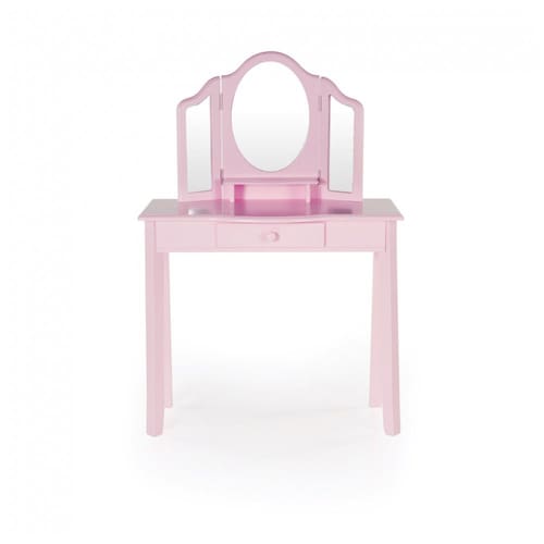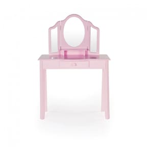 A penteadeira infantil Guidecraft Pink Vanity and Stool Set foi desenvolvida para compor um cantinho de vestir, maquiagem de faz de conta e organização de acessórios em quartos infantis. O conjunto inclui mesa com tampo retangular, gaveta central com puxador e espelho triplo em acrílico resistente a estilhaços, com moldura e laterais suavemente recortadas para compor o visual de penteadeira clássica em escala infantil.?