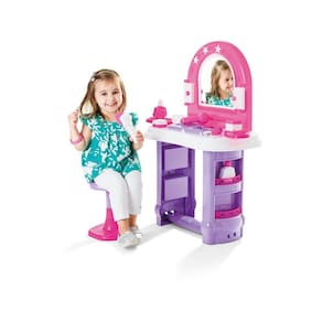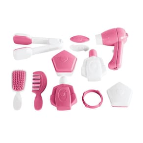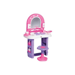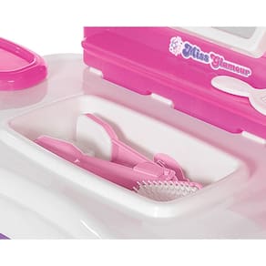 A penteadeira Miss Glamour tem banquinho e cores charmosas para se produzir! O brinquedo vem com muitos acessórios de beleza: pente, escovinha, porta jóias, pulseira, presilhas, secador e uma pranchinha. O espelho fica em 3 posições.