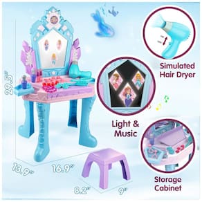 A penteadeira infantil Tsomtto com tema inspirado em Frozen é composta por mesa, cadeira e espelho central com iluminação e efeitos sonoros, formando uma estação compacta de maquiagem de faz de conta para crianças pequenas. O espelho possui imagens de princesa e ativação de músicas e luzes, enquanto a bancada acomoda os acessórios de brincadeira, como anéis, frascos de perfume, elásticos de cabelo, colares, presilhas, batons de brinquedo, espelho de mão, pente e secador que emite som. A estrutura é produzida em material plástico com cantos arredondados, espelho acrílico inquebrável e montagem simples por encaixe, exigindo 4 pilhas AA para funcionamento dos recursos eletrônicos.