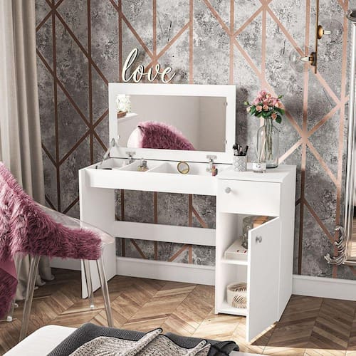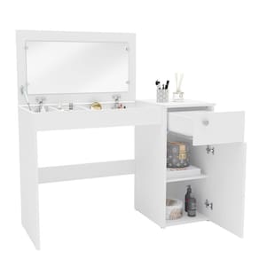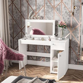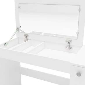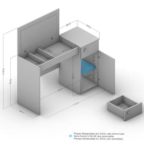 A penteadeira que vai complementar seu dormitório com muito estilo e sofisticação. E que mulher nunca sonhou em ter um cantinho especial para fazer aquela make e guardar todos os seus cremes e bijus? Com a Iracema tudo isso é possível! Seu espelho é recolhível, e quando fechado ela pode se tranformar em uma ótima escrivaninha. Assim você otimiza ainda mais os espaços. Além disso ela possui uma porta com prateleira, uma gaveta, e divisor de bijus! Perfeito para seu quarto. Acabamento da Gaveta: Pintura UV Acabamento da Porta: Pintura UV Acabamento da Prateleira: Pintura UV Acabamento dos Pés: Poliéster Acompanha Banqueta: Não Altura do Espelho: 44,5 cm Altura dos Pés: 1,4 cm Ambiente Principal: Quarto Complexidade da Montagem: Média: pode ser montado por mais de uma pessoa e/ou necessite de maior conhecimento para montagem Cor: Branco Cor do Produto: Branco Cor Flex: Não Cor Interna: Branco Escala de Brilho: Fosco Escala de Brilho da Gaveta: Fosco Escala de Brilho da Porta: Fosco Escala de Brilho da Prateleira: Fosco Espessura do Espelho: 15 mm Formato do Espelho: Retangular Gaveta com Chave: Não Informações Complementares: Fechado a penteadeira serve como bancada, e na sua abertura do tampo vira uma penteadeira com espelho e nichos porta objetos Itens Inclusos: 1 Penteadeira, Kit Ferragens, Manual de Montagem Largura do Espelho: 77,2 cm Manual de Montagem e Instalação: https://cdn2.madeiramadeira.com.br/atributo/politorno-moveis/1365388-200062.pdf Material da Gaveta: MDP Material da Porta: MDP Material da Prateleira: MDP Material do Puxador da Gaveta: Plástico Material do Puxador da Porta: Plástico Material dos Pés: Plástico Material Principal: MDP Montagem Flex: Não Necessita Montagem: Sim Origem do Produto: Nacional Pés Reguláveis: Não Peso: 26,89 kg Peso Máximo por Gaveta: 3 kg Peso Máximo por Prateleira: 5 kg Possui iluminação: Não Possui Moldura: Não Possui Pés: 06 Possui Porta Objetos: Sim Possui Portas: 01 Possui Prateleiras: 01 Possui Rodízio: Não Possui Vidro: Não Quantidade de Espelho: 01 Recomendações de Uso, Manutenção e Limpeza: Utilize um pano macio umedecido com água e sabão neutro, seguido de pano seco. Não utilize produtos químicos ou abrasivos para limpeza, pois estes danificam o revestimento do móvel. Sapatas Niveladoras: Sim Sistema de Montagem: Cavilha, Parafuso, Minifix Suporta Até (kg): 10 kg Tampo Basculante: Não Tipo de Corrediça da Gaveta: Metálica Simples Tipo de Dobradiça/Corrediça da Porta: Metálica Tipo de Fixação do Espelho: Botão Francês Tipo de Porta: Bater Tipo de Puxador da Gaveta: Externo Tipo de Puxador da Porta: Externo