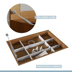 Exclusiva Penteadeira Multiuso com Espelho Tigus, podendo ser fechada apenas inclinando a parte superior, servindo como apoio para estudo, e uma possível cômoda para seu ambiente, além disso, oferece um amplo espaço interno com divisão interna para joias e maquiagem como seu grande diferencial, destacando-se de outras opções sendo eleita a penteadeira preferida do mercado. A penteadeira ideal para você, que merece ter todos esses benefícios em sua casa. Acabamento da Porta: Pintura UV Acabamento da Prateleira: Pintura UV Acompanha Banqueta: Não Altura do Espelho: 35 cm Ambiente Principal: Quarto Complexidade da Montagem: Média: pode ser montado por mais de uma pessoa e/ou necessite de maior conhecimento para montagem Cor: Ypê Cor do Produto: Ypê Escala de Brilho: Fosco Escala de Brilho da Porta: Fosco Escala de Brilho da Prateleira: Fosco Espessura do Espelho: 3 mm Formato do Espelho: Retangular Informações Complementares: Mesa multiuso para quem precisa estudar, ultilizar computador e também se produzir utilizando o tampo que, quanto aberto, possui um espelho e porta jóias/maquiagem. Itens Inclusos: 1 Penteadeira Multiuso, Kit Ferragens e Manual de Montagem. Largura do Espelho: 50 cm Manual de Montagem e Instalação: https://cdn2.madeiramadeira.com.br/atributo/tigus-baby/941078-manual-penteadeira-multiuso-tigus-revisao-01.pdf Material da Porta: MDP Material da Prateleira: MDP Material do Puxador da Porta: MDF Material Principal: MDP Necessita Montagem: Sim Origem do Produto: Nacional Peso: 29,55 kg Peso Máximo por Prateleira: 5 kg Possui iluminação: Não Possui Moldura: Não Possui Pés: Não Possui Porta Objetos: Sim Possui Portas: 02 Possui Prateleiras: 01 Possui Vidro: Não Quantidade de Espelho: 01 Recomendações de Uso, Manutenção e Limpeza: Limpar com pano macio e levemente umedecido. Não utilizar solventes a base e de inflamáveis. Não utilizar produtos abrasivos. Sapatas Niveladoras: Não Sistema de Montagem: Parafusos, cantoneiras e cavilhas. Suporta Até (kg): 20 kg Tampo Basculante: Sim Tipo de Dobradiça/Corrediça da Porta: Metálica Tipo de Fixação do Espelho: Silicone Tipo de Porta: Misto (Bater e Basculante) Tipo de Puxador da Porta: Externo