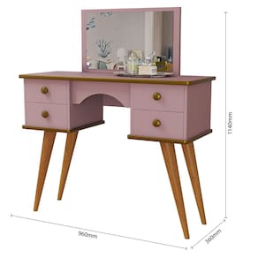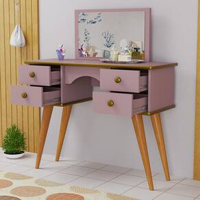 Especificações Técnicas - Design retrô com pés palito em madeira - Estrutura resistente com acabamento pintado. - 4 gavetas espaçosas para organização de maquiagem e acessórios. - Espelho para facilitar a rotina de beleza. -Cor rosa com detalhes em dourado, ideal para decoração moderna e delicada. - Compacta e funcional, adapta-se a quartos pequenos e médios.