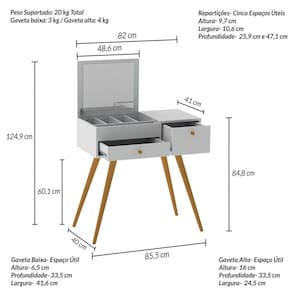 - Quantidade de Pés: 4 - Medida do Produto Montado (LXCXA): 41cmx82cmx84,2cm - Peso do Produto Montado: 23800 - Peso Máximo Suportado: 20 - Acabamento: Pintura Uv - Escala de Brilho: Acetinado - Material da Estrutura: MDF E MDP 15 E 25 mm - Produto Necessita de Montagem?: Sim - Quantidade de Gaveta: 2 - Tipo de Gaveta: Gavetas com corrediças roldanas - Tipo de Pés: Pés em madeira palito envernizado - Possui Espelho?: Espelho 3mm de espessura - Recomendações de manutenção: Pano úmido. Não aplicar lustra móveis. - Volumes: 1 - Garantia: 3 meses