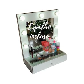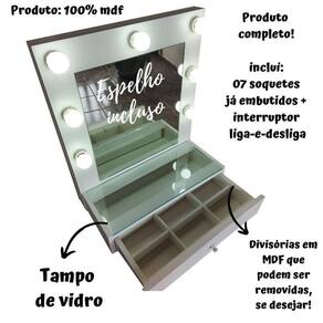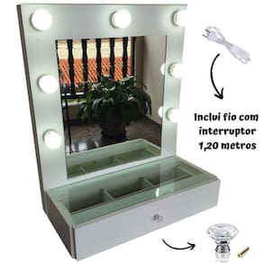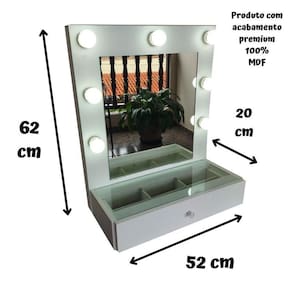 A penteadeira suspensa de parede maggie modelo 7 bocais, chegou para renovar seu ambiente, um charme total para seu quarto e para organizar sua maquiagem no dia a dia, essa penteadeira é fabricada em material de primeira qualidade 100% mdf, possui camarim embutido com 7 soquetes + fiação com tomada liga-e-desliga: completa tampo de vidro e a gaveta comporta o organizador de maquiagem. Além disso, as divisórias da gaveta são fabricadas em mdf, o que garante a durabilidade e resistência e você pode optar por remover ou ajustar essa peça interna, do se jeito O produto é entregue montado, sem gastos extras, só instalar na parede Espelho incluído Fiação instalada incluída + fio com liga-e-desliga Inclui 07 soquetes já instalados/embutidos Não inclui lâmpadas Voltagem bivolt 110 / 220 v bivolt Modelo soquete: e27 Material: 100% mdf Peso suportado: 12kg gaveta + tampo de vidro Qual o diferencial dos produtos 100% mdf - durabilidade. - resistencia. - resistente a umidade. - fácil de limpar e manter. - excelente uniformidade do material e homogeneidade da superfície, evitando farpas, falhas e trincas. - produto ecologicamente correto madeira provida de áreas reflorestada . Cor do produto: branco tx fosco Medidas: Moldura: Altura 62 cm Comprimento 52 cm Espelho: Altura 40 cm Largura 37 cm Medida pode ter pequena variação Gaveta: Largura 52 cm Profundidade 20cm Tampo de vidro: 52 x 20 cm Espessura do mdf: 15mm Ps: medidas podem variar em questão de cm's. Inclui: Parafusos para instalação, espelho, 1 gaveta e 1 puxador de gaveta, 07 soquetes + fio com liga-e-desliga . Marca: Não Informado