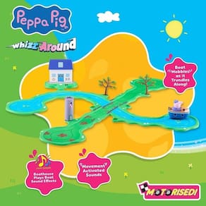 No cenário mágico de Peppa Pig, o playset Bobbing Along Boat Trip Whizz-Around cria uma aventura cheia de movimento e som. A casa-barco repousa sobre uma base que se conecta a 4 trilhos de rio, 2 curvas, uma ponte, além dos trilhos de estrada com suas curvas. O barco do Vovô Pig navega pelas águas e estradas imaginárias, enquanto duas árvores e um castelo completam o ambiente encantador. Sons que se ativam com o movimento e um sensor de luz trazem melodias temáticas e seis frases divertidas, dando vida e personalidade a cada passeio. Cada viagem convida a mergulhar em histórias cheias de imaginação e descobertas.