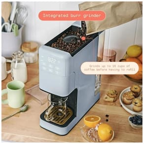 A Perfect Grind Cornflower Blue é uma máquina de café drip single serve com moedor burr integrado que mói grãos inteiros para preparos personalizados de 177 a 473 ml (6-16 oz), incluindo opções de força regular, bold ou over ice, e reservatório removível de 1,89 L para vários ciclos diários sem reposição constante.