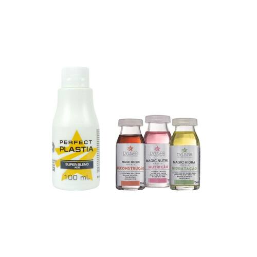 Escova Progressiva Perfect Plastia 100ml Dyusar Professional Hair A Escova Progressiva Dyusar Perfect Plastia oferece um alisamento eficaz e duradouro para todos os tipos de cabelo, controlando o volume e eliminando o frizz. Sem formol e aprovada pela ANVISA, a fórmula contém proteínas de queratina, aminoácidos e seis ácidos Hialurônico, Lático, Glicólico, Salicílico, Lipoico e Ascórbico , que hidratam e reestruturam os fios, proporcionando brilho intenso e efeito liso de até 100%. O uso requer a aplicação mecha a mecha, seguida de um tempo de ação de 30 a 50 minutos e finalização com escova e prancha. Precauções: Uso externo; evitar contato com os olhos e aplicar em pele saudável. Conservar em local fresco e seco. Consultar um médico antes do uso na gravidez e realizar teste de sensibilidade. Registro ANVISA: 25351.274931/2018-21 Ampola De Nutrição Magic Nutri 15ml Dyusar Professional Hair Descrição: Ampola que nutre e revitaliza os cabelos, proporcionando hidratação profunda e fortalecimento. Ingredientes e Benefícios: Ácido Lático: Reforça e reconstrói a fibra capilar. Óleo de Coco: Cria uma película protetora e fortalece a estrutura capilar. Óleo de Uva: Ação antioxidante que revitaliza os cabelos. Óleo de Abacate: Oferece alta nutrição e hidratação. Modo de Uso: Misture com água até formar um creme consistente. Aplique nos cabelos úmidos após lavagem, deixe agir de 3 a 10 minutos e enxágue. Precauções: Uso externo. Manter fora do alcance de crianças. Evitar contato com os olhos; em caso de contato, enxaguar abundantemente com água. Produto aprovado pela ANVISA. Ampola De Hidratação Magic Hidra 15ml Dyusar Professional Hair Descrição: Ampola que proporciona hidratação profunda e controle do frizz, restaurando a maciez e o brilho. Ingredientes e Benefícios: Glicerina-bi-destilada: Promove maciez, brilho e controle do frizz. Lipídios Botânicos: Hidratação profunda para cabelos ressecados. Ácido Lático: Reforça a fibra capilar e proporciona reconstrução. Pantenol Vitamina B5 : Hidrata, previne danos e auxilia no crescimento dos cabelos. Modo de Uso: Misture com água até formar um creme consistente. Aplique nos cabelos úmidos após lavagem, deixe agir de 3 a 10 minutos e enxágue. Precauções: Uso externo. Manter fora do alcance de crianças. Evitar contato com os olhos; em caso de contato, enxaguar abundantemente com água. Produto aprovado pela ANVISA. Ampola De Reconstrução Magic Recon 15ml Dyusar Professional Hair Descrição: Ampola ideal para restaurar a estrutura dos cabelos, proporcionando uma reconstrução completa. Ingredientes e Benefícios: Proteína do Trigo: Restaura a flexibilidade natural dos cabelos. Ácido Lático: Reforça a fibra capilar e proporciona reconstrução. Colágeno e Queratina: Reconstroem a fibra capilar, proporcionando resistência e brilho. Modo de Uso: Misture com água até formar um creme consistente. Aplique nos cabelos úmidos após lavagem, deixe agir de 3 a 10 minutos e enxágue. Precauções: Uso externo. Manter fora do alcance de crianças. Evitar contato com os olhos; em caso de contato, enxaguar abundantemente com água. Produto aprovado pela ANVISA. Marca: Dyusar Cosmeticos