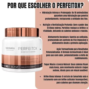 Para cabelos indisciplinados que precisam de transformação, Perfeitox é o tratamento completo, oferecendo hidratação profunda, brilho e controle de frizz como você nunca viu. Sua fórmula avançada combina 19 aminoácidos essenciais que atuam na reconstrução capilar, restaurando a saúde dos fios danificados e devolvendo sua força natural. Com um blend exclusivo de 12 óleos nobres, Perfeitox penetra profundamente na fibra capilar, nutrindo intensamente e revitalizando a estrutura dos fios, proporcionando disciplina e alinhamento duradouro.