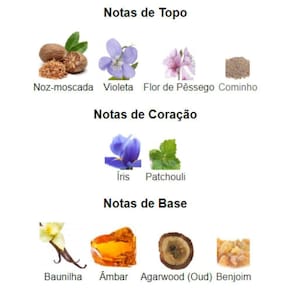 As notas de coração incluem lavanda, gerânio e violeta, que adicionam um toque floral e aromático ao perfume.