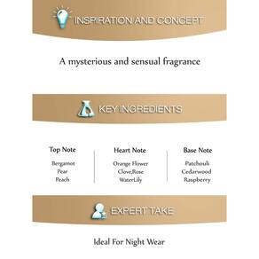 - Rosa, lírio patchouli, cedro, baunilha, laranja amarga e notas de framboesa