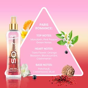 - Perfume feminino requintado: Paris Romance Body Mist é um eau de parfum exclusivo para mulheres. Com notas de topo de tangerina, pimenta rosa e notas verdes, é uma mistura perfeita de perfume frutado e perfume floral.
