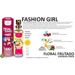Descrição do produto A fragrância fashion girl da linha magic candy da amakha paris é perfeita para meninas que adoram levar uma vida divertida, doce e colorida. Este lançamento é uma fragrância classificada como água de colônia de floral frutal. Com notas de saída que combinam o frescor de um banho de piscina à tarde com o sabor delicioso de uma maçã do amor de circo, evolui para notas de balinha de abacaxi com o romantismo do jasmim transparente e finaliza com o açúcar gostoso de uma bala de coco. Tudo muito fashion e divertido, como as meninas gostam de ser. Sem álcool etílico e com matérias-primas e qualidade, essa água de colônia é perfeita para sua criança.