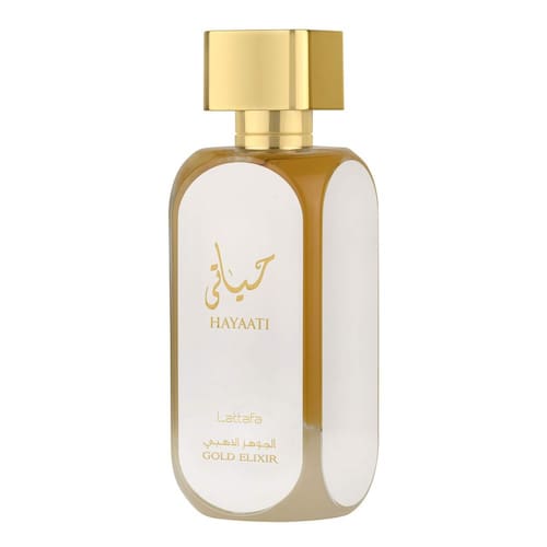 Spray de eau de parfum Lattafa Hayaati Gold Elixir para unissex, 3,4 onças — As notas principais são bergamota, cassis e toranja — As notas médias são couro, pêssego e açafrão — As notas de base são baunilha, âmbar, almíscar e vetiver — Hayaati Gold Elixir da Lattafa Perfumes é uma fragrância para mulheres e homens