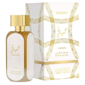 Spray de eau de parfum Lattafa Hayaati Gold Elixir para unissex, 3,4 onças — As notas principais são bergamota, cassis e toranja — As notas médias são couro, pêssego e açafrão — As notas de base são baunilha, âmbar, almíscar e vetiver — Hayaati Gold Elixir da Lattafa Perfumes é uma fragrância para mulheres e homens