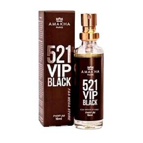 O Perfume 521 Vip Black Masculino Amakha Paris vem em uma embalagem de 15ml, perfeita para levar no bolso e usar em qualquer ocasião. Cada frasco rende de 200 a 220 borrifadas, de acordo com o fabricante.