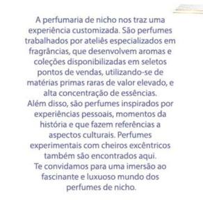 Perfumes de Nicho A linha Parfum Brasil Niche apresenta inspirações nos sofisticados perfumes de nicho, com concentração a partir de 30% dos mais nobres óleos essenciais, aromas únicos e exclusivos.
