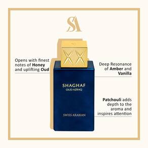 A fragrância quente, picante e coriácea de Shaghaf Oud Azraq é uma fragrância atraente para mulheres e homens da casa da Arábia Suíça. Introduzido em 2022, este perfume começa com notas de ágar e néctar das flores e depois passa para notas de âmbar, bourbon, baunilha e canela. A base é atraente com toques de patchouli e couro.