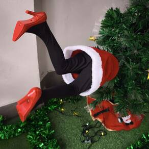 As pernas de Mamãe Noel possui movimento, parecendo que realmente está presa na árvore e precisa de ajuda. É diversão garantida, perfeito para encantar crianças e adultos, criando um ambiente leve e alegre.
