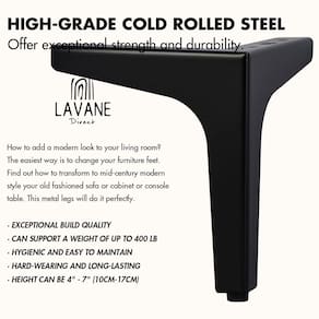 Funcionalidade - Pernas de móveis de metal – Feito de ferro resistente, rígido e durável para uso prolongado; - Forte capacidade de carga: suporte firme e com capacidade de carga mais forte, 180 kg por perna; - Fácil de instalar – Fácil de instalar, eleve a altura do seu sofá ou mude o estilo substituindo as pernas; - Ótimos acessórios DIY – O tapete de borracha protege seu piso contra arranhões, ótimo protetor e decoração para sua casa; - Ampla aplicação – Acessórios para móveis, armários, prateleiras, sofá, cama, otomano, sofá, cadeira, mesa etc. Especificação - Condição: 100% novo; -Material: Ferro; - Largura da parte superior: 13 cm; - Espessura: 1,8 mm; Dicas quentes - A cor pode ser ligeiramente diferente do produto real devido ao efeito da luz e configuração do monitor. - Considere uma diferença de 1 a 2 mm devido à medição manual. Incluído na embalagem: - 4 x pernas de móveis. -16 parafusos - Pernas de móveis de metal modernas do século médio – as pernas de sofá estilo meados do século dão um novo visual à sua casa no dia a dia. Além disso, pode adicionar moda aos seus vários projetos de móveis DIY respeitando seu orçamento. - Capacidade de carregamento muito mais forte – Feito de ferro de alta dureza (1,8 espessura) com durabilidade e forte capacidade de carga. A capacidade de peso é de 200 kg por perna (aprox.). Não há necessidade de se preocupar com a quebra devido ao peso pesado. Se você deseja uma atualização ou aumento em peças de móveis, estas pernas de sofá de metal são uma opção perfeita. - FÁCIL DE INSTALAR - Projetos de melhoria da casa não precisam levar dias ou até horas - para serem concluídos! Nossas pernas de mesa vêm com furos e parafusos pré-perfurados, então a instalação é rápida e indolor para todos os níveis de habilidade! Fácil de elevar a altura do seu sofá ou mudar o estilo substituindo as pernas. - Excelente trabalho – a superfície delicada foi tratada com tinta galvanoplastia para que seja resistente à abrasão e à corrosão sem ferrugem, ótima para projetos de móveis fixos de longo prazo. Na parte inferior da perna, há uma almofada de borracha que pode proteger o chão de ser utilizado pelos móveis. - Multiuso – Não apenas perfeito para o sofá, mas também para o armário, mesa, sofá, cadeiras, cama, suporte de TV, assentos de amor, cama, mesa, pufes, armários, cômoda, prateleiras, estante ou outros móveis DIY domésticos.