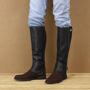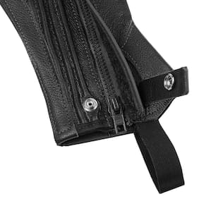 Perneira Bronc-Steel fabricada em couro na cor Preta, possui fechamento por zíper reforçado, costuras reforçadas, duas presilhas de pressão para maior firmeza e elástico na parte inferior que passa pelo solado do calçado.