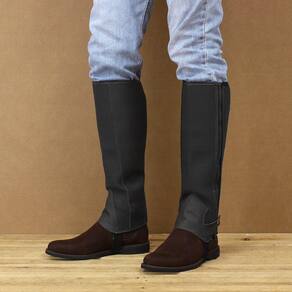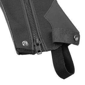 Perneira Bronc-Steel fabricada em neoprene na cor Preta, possui fechamento por zíper reforçado, partes reforçadas em couro, costuras reforçadas, presilha de pressão para maior firmeza e elástico na parte inferior que passa pelo solado do calçado.