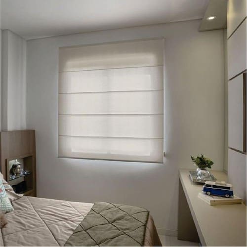 A persiana romana é formada por gomos largos e horizontais que dobram a medida que a persiana abre e fecha. O seu tecido translucido é uma solução para quem busca privacidade e ambiente claro, pois seu tecido permite a entrada de luz difusa, ainda assim bloqueando a visão exterior.
