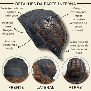 - Tamanho da peruca M (padrão) com alças internas ajustáveis;- Touca interna vazada (Maior respiração no couro cabeludo).