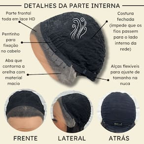 - Fibra 100% orgânica futura; - 30cm de comprimento; - Aceita chapinha até 200º; - Front Lace 13x1 com tela HD; - Possui três pentes internos para maior fixação; - Peso do produto 165gm em média; - Tamanho da peruca M (padrão) com alças internas ajustáveis. Marca: LIONSWIG