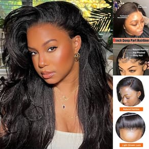 - ?Vantagens das perucas frontais de renda Yaki? Peruca frontal de renda transparente HD de 33 x 15 cm, espaço de divisão profundo de 15 cm, pode fazer rabo de cavalo alto e coque. Tamanho médio da touca 56-57 cm com 3 pentes e alça ajustável, fácil de ajustar e durável, pode ajudá-lo a fixar na sua cabeça, serve para todas as cabeças.