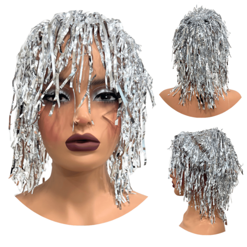 Peruca metalizada festa fantasia carnaval franja colorida - Cor: Prata