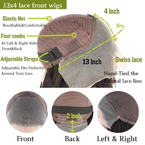 Perucas frontais de renda 33 x 10 cm. Tamanho da touca: Tamanho médio (54,5 a 57 cm) Alças ajustáveis e 4 pentes para fácil ajuste.