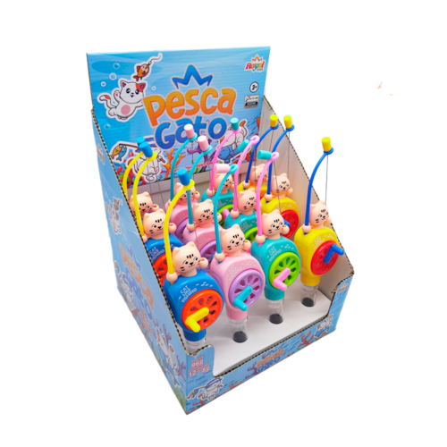Mas a surpresa não acaba aí! O gato está firmemente ligado à parte superior de um tubo recheado com deliciosas balinhas sabor Tutti Frutti. Cada movimento de pesca pode ser recompensado com um doce, tornando a brincadeira ainda mais gostosa e motivadora. Com um display contendo 12 unidades, o Pesca Gato é o complemento perfeito para festas infantis ou como uma lembrancinha encantadora.