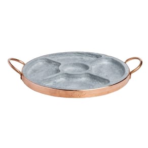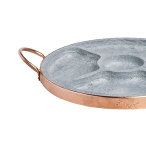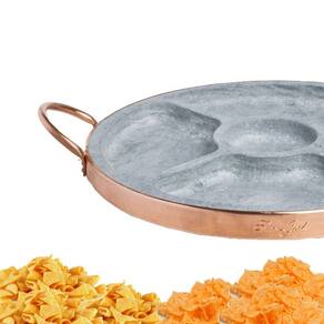 Petisqueira em pedra sabão e cobre com divisória, ideal para servir petiscos quentes ou frios, mantendo a temperatura dos alimentos por mais tempo. Possui 5 divisórias para organização e acabamento em cobre para charme e resistência. Perfeita para churrascos, bares e restaurantes.Bica móvel