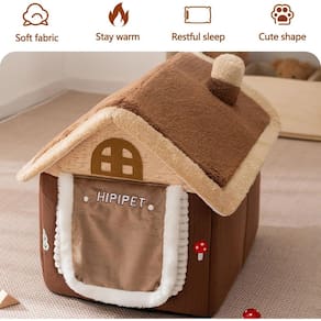 Especificação Material: Pelúcia Cor: marrom Peso: 230 g Tamanho do produto: 40 x 32 x 32 cm Lista de embalagem: 1 x Pet HouseWarm and Comfortable — Feito com materiais de pelúcia macios para manter os animais de estimação aconchegantes e seguros nas estações frias. Design fofo de desenho animado — O formato adorável da casa com chaminé e a placa “HIPIPET” adiciona charme a qualquer decoração de casa. Almofada removível — O travesseiro removível e lavável garante fácil limpeza e frescor duradouro. Estável e durável — A estrutura reforçada mantém a forma enquanto fornece um espaço seguro para gatos e cães pequenos. Perfeito para animais de estimação pequenos — Ideal para gatos ou cães pequenos com menos de 7,5 kg, oferecendo a eles um local de descanso privado e aconchegante.