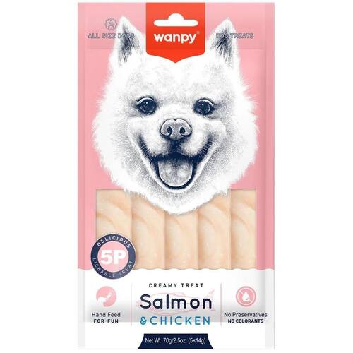 Petisco Para Cães Wanpy Creamy Sabor Salmão E Frango Pacote C/5 Unidades - 70G Os sucessos em creamy chegaram para o seu aumigo creamy petiscos cremosos da wanpy foi desenvolvido para oferecer uma experiência de sabor, diversão e conexão com o seu pet. São ideais para cães de todos os tamanhos e idades, garantindo um petisco prático e nutritivo. Além disso, são livres de corantes e conservantes artificiais, sendo saudáveis para o pet. O creamy salmão e frango oferece uma mistura deliciosa de salmão 55,98% e frango 32,2% , criando um petisco rico em proteínas de alta qualidade. A fórmula proporciona uma textura cremosa, enquanto as vitaminas a, b2, b3, b5, d3, e auxiliam no organismo do pet. Composição básica: carne de salmão 56%, frango 32%, amido de mandioca 11%, vitaminas a, b2, b3, b5, d3, e , goma de xantana 1%. Enriquecimento mínimo por kg: vitamina a 1000ui/kg, vitamina b2 0,2mg/kg, vitamina b3 0,703mg/kg, vitamina b5 0,25mg/kg, vitamina d3 10ui/kg, vitamina e 1ui/kg. Níveis de : Umidade máx. 900g/kg Proteína bruta min. 65g/kg Fibra bruta máx. 10g/kg Matéria mineral máx. 20g/kg Extrato etéreo min. 1000mg/kg Cálcio min. 100mg/kg Cálcio máx. 1000mg/kg Fósforo min. 500mg/kg