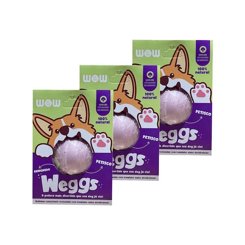 Os Weggs são bolinhas totalmente comestíveis, feitas com fécula de mandioca e recheadas com petiscos de lombinho suíno desidratado. Além de serem surpreendentemente divertidos, esses petiscos são deliciosos e saudáveis para o seu melhor amigo.