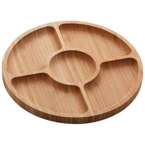 Petisqueira c/5 divisórias de Bambu Round 25x25x1,6cm A petisqueira redonda de bambu com 5 divisórias, é perfeita para usar nos seus eventos e permite que você sirva diferentes aperitivos. Ela é produzida com material ecológico o que trará sofisticação e funcionalidade, tornando sua recepção mais prazerosa.