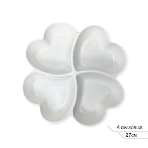 Petisqueira 4 Divisórias formato de Coração 27cm Essa petisqueira é perfeita quem preza pela elegância na hora de receber seus convidados em casa, fazer festas, reuniões e até mesmo num encontro a dois. Deixe sua mesa linda e charmosa, recheada com petiscos deliciosos. Pode ser utilizada para servir salgados, aperitivos, queijos e fondues Salgados e Doces. Possui 4 divisórias em formato de coração, deixando a apresentação mais elegante. Feita em Melamina traz uma maior durabilidade ao produto e fácil de higienizar.